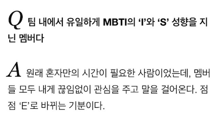 Q5. 팀 내에서 유일하게 MBTI의 ‘I’와 ‘S’ 성향을 지닌 멤버다