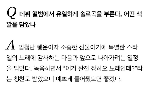 Q10. 데뷔 앨범에서 유일하게 솔로곡을 부른다. 어떤 색깔을 담았나