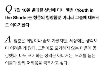 Q4. 7월 10일 발매될 첫번째 미니 앨범 <Youth in the Shade>는 청춘의 청량함뿐 아니라 그늘에 대해서도 이야기한다