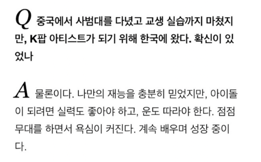 Q2. 중국에서 사범대를 다녔고 교생 실습까지 마쳤지만, K팝 아티스트가 되기 위해 한국에 왔다. 확신이 있었나