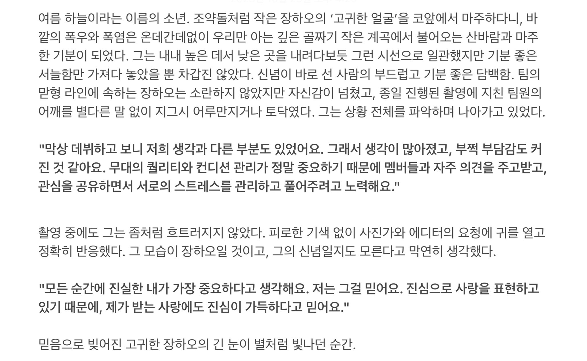 “모든 순간에 진실한 내가 가장 중요하다고 생각해요. 저는 그걸 믿어요. 진심으로 사랑을 표현하고 있기 때문에, 제가 받는 사랑에도 진심이 가득하다고 믿어요.”